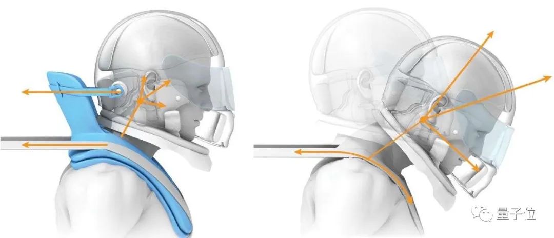 简单来看,它是一个可以卡在车手脖子上的U型装置,挂带能与车手的头盔连接。