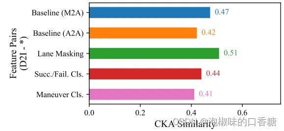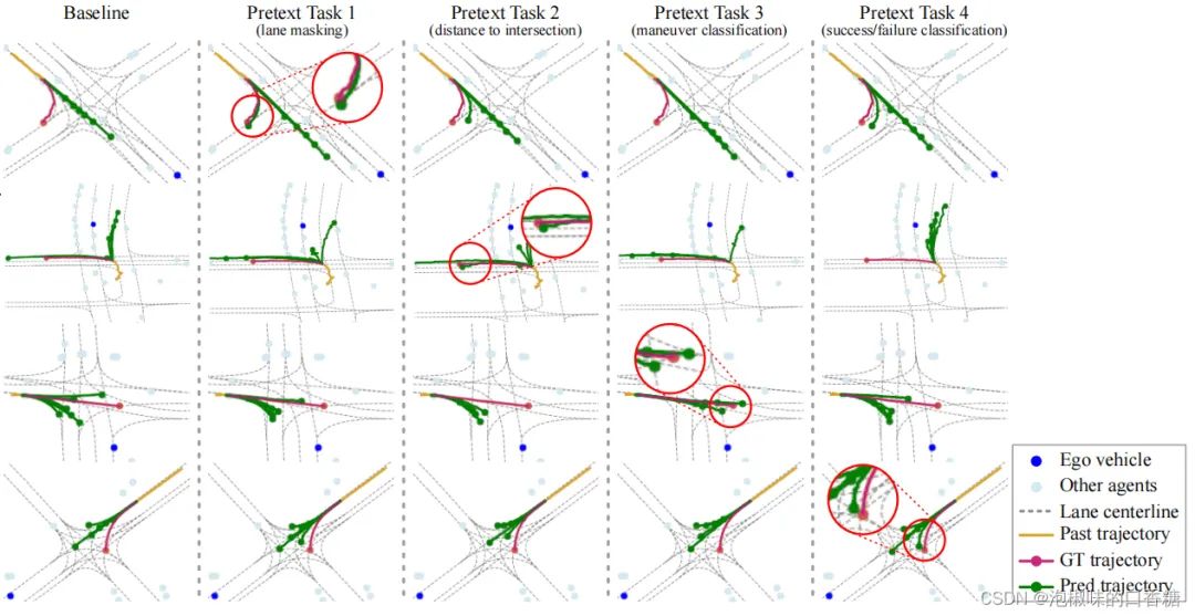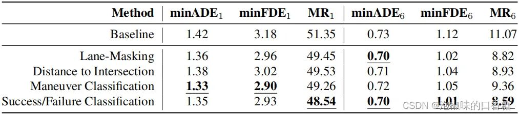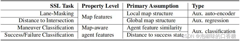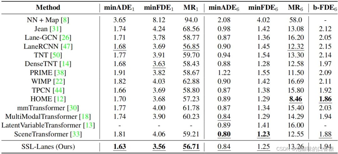 在2022论文"SSL-Lanes: Self-Supervised Learning for Motion Forecasting in Autonomous Driving"中,作者提出了SSL-Lanes,它以伪标签的形式利用从数据中生成的监控信号,并将其与标准的运动预测模型相集成,还在大规模Argoverse数据集上验证。SSL-Lanes的一个很大的优点是它具有高的准确性,同时具有低的架构复杂度和高的推理速度。作者还证明了所有提出的SSL假设性任务都比普通的运动预测基线有所改进,特别是在左/右转和加速/减速这样的困难情况。
