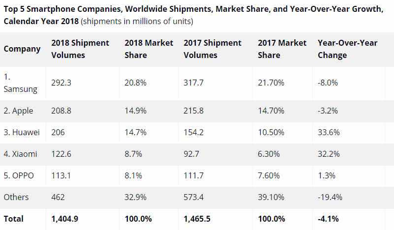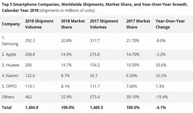 IDC 2018年智能手机全球市场销量数据