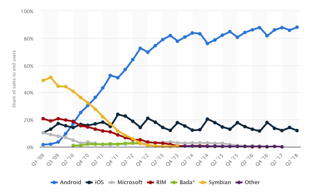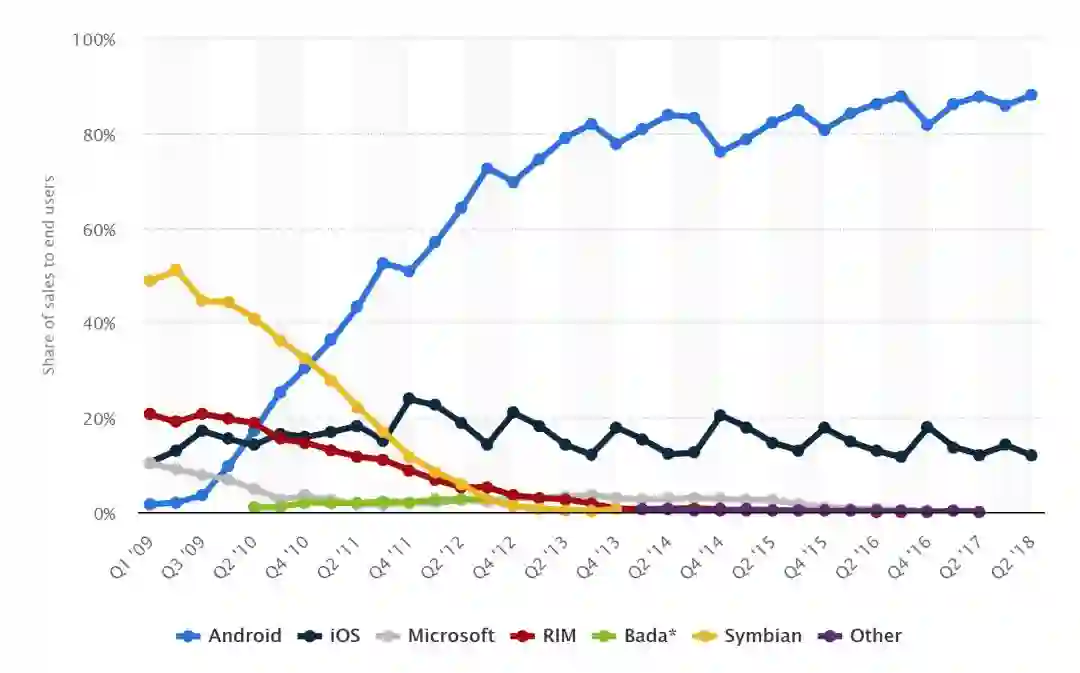 10 年过后,手机行业发生了翻天覆地的变化。塞班已然作古,Android 和 iOS 占据了几乎 100%的移动操作系统份额。由于采用厂商众多,Android 成为了全球第一大手机 OS。