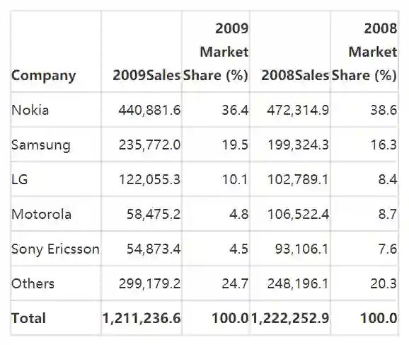 2009 年的全球手机市场份额,被诺基亚、三星、LG、摩托罗拉和索尼爱立信等国际厂商所瓜分,诺基亚凭借 36.4%的市场份额稳坐全球第一大手机厂商的交椅。