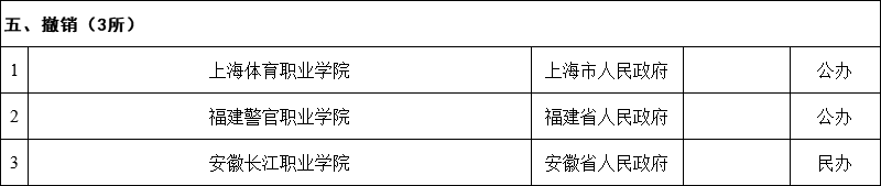 此外,上海体育职业学院、福建警官职业学院、安徽长江职业学院这3所高校被撤销。
