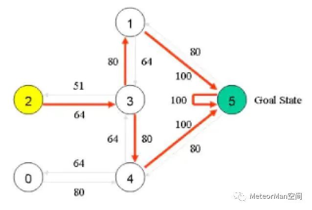 上图就是房间对应的布局图。首先呢将机器人(agent)随机的选择一个位置放下,让它自己随意走动,直至走到5号房间,表示成功。为了能够走出去,可以针对每个节点之间的连接边设置权重,将能够直接到达5号房间的边权重设为100,其余不能直接到达的边权重设置为0,依据这种机制上图可更新为: