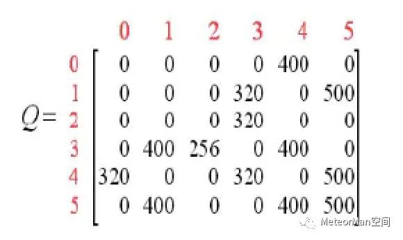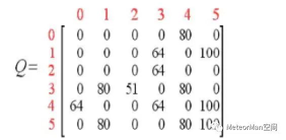 随后对其规范化,每个非零元素除以矩阵Q的最大元素值(此处为500),可得: