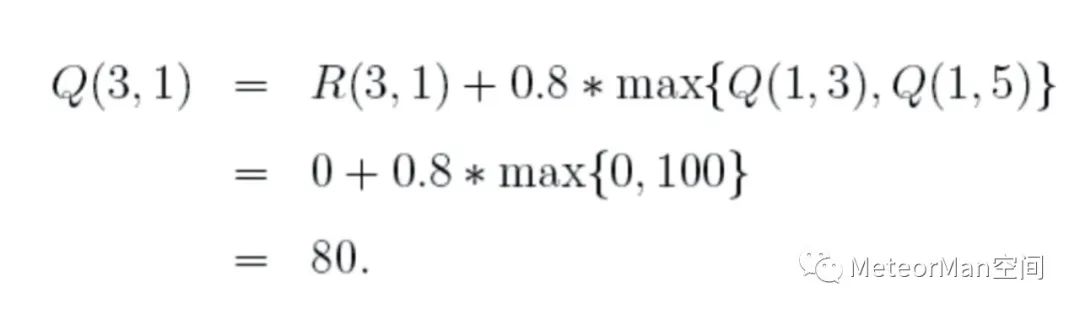 (2)状态3不是目标状态,继续查看状态3所对应的的R表,找到可能的下一个行为(到达1、到达2以及到达4),随机的选择到达1这个行为,根据状态转移方程计算Q(3,1):
