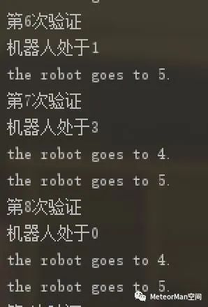 state = random.randint(0, 5)print('机器人处于{}'.format(state))count = 0while state != 5:if count > 20: # 如果尝试次数大于20次,表示失败print('fail')break# 选择最大的q_maxq_max = q[state].max()q_max_action = []for action in range(6):if q[state, action] == q_max: # 选择可行的下一个动作q_max_action.append(action)# 随机选择一个可行的动作next_state = q_max_action[random.randint(0, len(q_max_action) - 1)]print("the robot goes to " + str(next_state) + '.')state = next_state