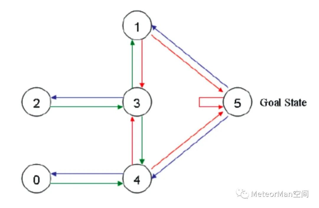 在Q-Learning算法中,最重要的思维就是“状态”和“动作”这两个抽象表示,以上图为例,状态指的就是图中的哪个节点(可以是2节点,可以是5节点......),动作则指的是从一个节点到另一个节点的操作,如从1节点到3节点这一个操作就是一个动作行为。