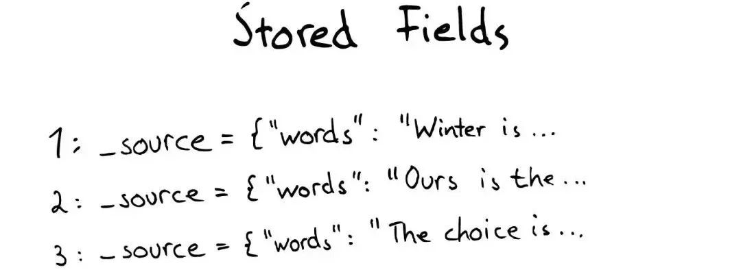 当我们想要查找包含某个特定标题内容的文件时,Inverted Index就不能很好的解决这个问题,所以Lucene提供了另外一种数据结构Stored Fields来解决这个问题。本质上,Stored Fields是一个简单的键值对key-value。默认情况下,ElasticSearch会存储整个文件的JSON source。