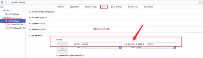在Xcode中,选择你的工程设置项,选中“TARGETS”一栏,在“info”标签栏的“URL type“添加“URL scheme”为你所注册的应用程序id(如下图所示)。