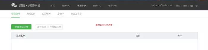 首先你需要去微信开放平台注册账号,在这里要吐槽一下,不知道这个微信平台的账号密码验证机制,忘了以前的密码,重新登录,各种找回密码都不行,实在没辙,去注册个Gmail😑,登录成功后,可以看到如下界面。