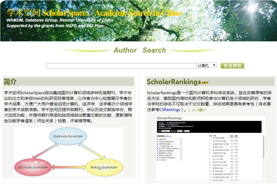 学术空间ScholarSpace中文学术信息集成系统由中国人民大学信息学院网络与移动数据管理实验室(WAMDM)开发,从2008年至今已收录2,297,097篇论文(25个领域)、4,003,276篇学位论文(53个领域)和1,350,755位研究人员。并在此基础上进行扩展,涵盖 5个子系统:
