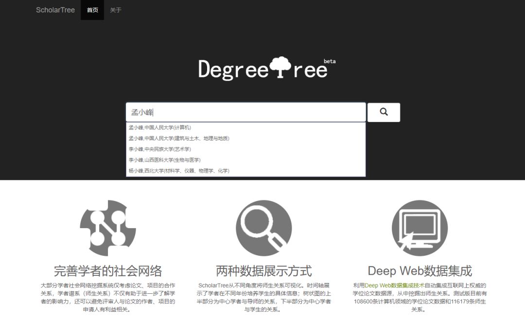 利用Deep Web技术自动集成权威的学位论文数据源,通过实体识别、关系抽取和实体链接等挖掘出师生关系。目前,已收录4,003,276篇学位论文,涉及678,864名导师、1,391个单位和53个领域,共挖掘出4,643,028对师生关系,形成了一个相对庞大的师生关系数据库,使学者社会网络更加全面,还可能帮用户找到与其他学者的间接联系。同时,在选择论文或项目评审专家时,如果能考虑师生关系,就能避免论文作者或项目成员与评审专家利益相关的局面。