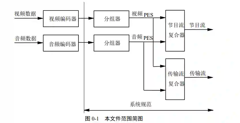 本文件论述了这样一个问题,即如何将单路或多路基本音频和视频流以及其它数据组合成为适合于存储和传输的单路和多路复合流。系统编码遵循本规范指定的语法和语义规则,并提供了使解码器缓冲区能在一个宽范围的补偿或接收条件下同步解码的信息。系统编码被指定为两种形式:传输流和节目流。每一种针对不同的应用集合加以优化,本文件本文件中定义的传输流和节目流提供了编码语法,该语法对于同步解码及展现音频、视频信息是必要的也是充分的,同时保证了解码器中数据缓冲区不发生上溢和下溢。在该语法中,利用有关编码音频和视频数据解码和演示的时间戳以及有关数据流自身传输的时间戳对信息进行编码。传输流和节目流都是面向分组的多路复合流。单一音频和视频基本流的多路复合过程参见图0-1。视频数据按GB/T 17975.2或GB/T 20090.2或GB/T20090.16或GB/T 33475.2编码,音频数据按GB/T 17975.3或GB/T 20090.10或GB/T 33475.3或GB/T22726编码。压缩数据被打包以形成PES分组。在形成PES分组的过程中可能会加入独立使用传输流或节目流的PES分组所需的信息。当PES分组进一步与系统层信息结合形成传输流或节目流时,这一信息是不必要的也是不能加入的。本系统标准覆盖了竖直虚线右边所示的处理过程。
