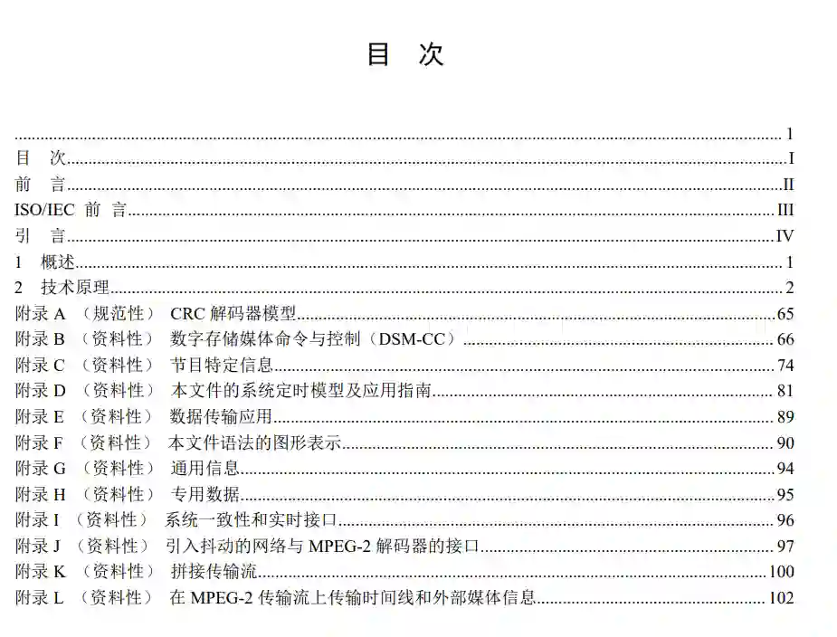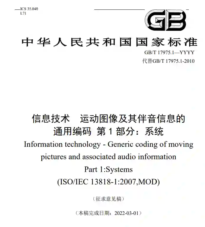 《信息技术运动图像及其伴音信息的通用编码第1部分:系统》国家标准意见稿,本文件给出系统层编码规范。它主要被设计用于支持把 GB/T 17975 第2 部分和第3 部分定义的视频和音频编码方式或者 GB/T 20090 第 2 部分、第 16 部分和第 10 部分定义的视频和音频编码方式或者GB/T 33475 第 2 部分和第 3 部分定义的视频和音频编码方式或者 GB/T 22726 定义的音频编码方式组合起来。系统层支持以下五个基本功能:1) 解码时多条压缩流的同步;2) 多条压缩流交织为一个单一流;3) 为启动解码而对缓冲区进行初始化;4) 连续的缓冲区管理;5) 时间标识。