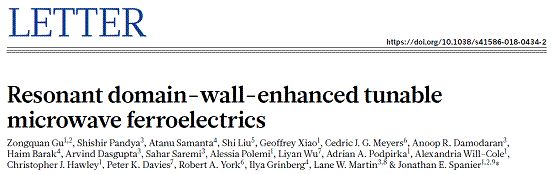 2018年8月21日,Nature(《自然》)在线发表了题为“Resonant domain-wall-enhanced tunable microwave ferroelectrics”(《畴壁谐振增强的可调制微波铁电体》)的研究论文。署名单位为Drexel University,顾宗铨博士为第一作者,Jonathan Spanier教授为通讯作者。