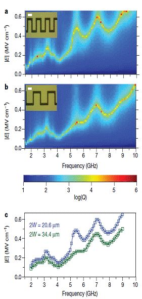 图2:(a)(b)薄膜样品在不同电极尺寸下,1 GHz至10 GHz测得的质量因子Q关于电场E的谐振谱;(c)图a和b中在每个频率的质量因子Q的最大值.