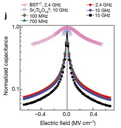 图1:(a)Ba0.8Sr0.2TiO3关于温度T和应力us的相图;(j)实验测得微波频率下(100 MHz — 15 GHz)的电容调制比n,以及和其他最好性能的薄膜微波可调电容的比较。