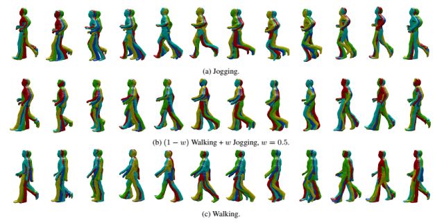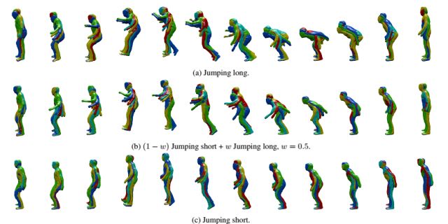 在本文中,作者通过使用有限数量的训练框架捕获的性能,来构建无限数量的主体运动的变化。在此,作者假定一个特定类型的运动并以此作为输入,如运动(行走、跑步、转弯等)或跳跃(跳跃远、近、高、低等),学习一系列运动以后重新采样获得新的变化。