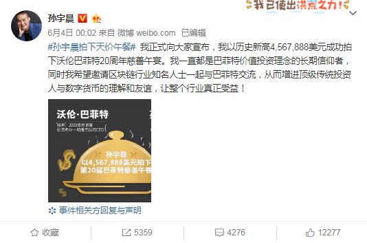 这些高调的操作确实符合孙宇晨的身份,他是波场TRON创始人、Bittorrent CEO,还是一个微博签约的自媒体,波场币一度被称为最大的空气币,项目至今都未看得见产品,以巴菲特午宴将波场币推向公众视野,为自己炒起热度,吊起波场币的价格。看他事先埋伏笔,事后大肆宣扬,如果这还不是一场营销,那什么才是呢。。。