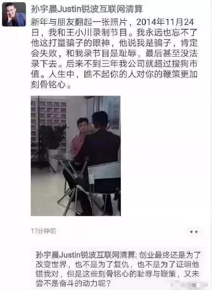 据说,此次互怼源于孙宇晨朋友圈曾自述2014 年与王小川一起录制节目时,被对方称作骗子,断言自己肯定会失败。