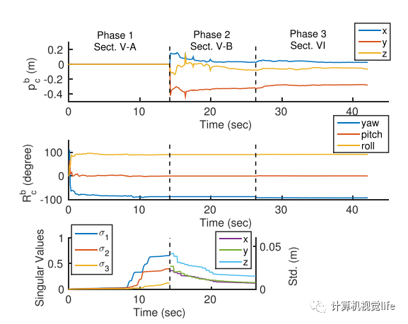 从图中可以看到,随着 的增长,当 接近0.1的时候,相机和IMU之间的相对旋转 逐渐趋于一个稳定的值,此时求得的特征点的位置的精度已经达到5cm以内了。