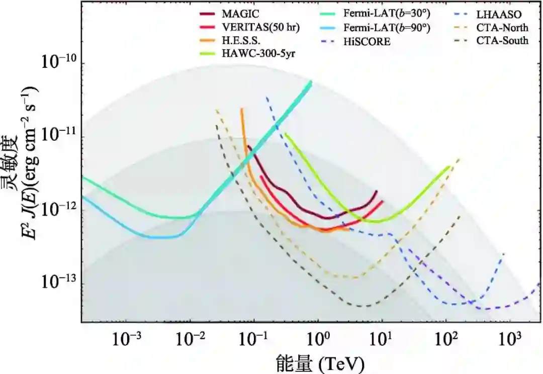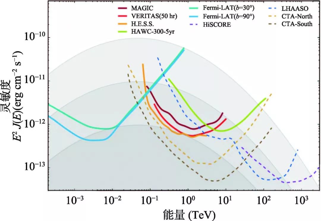 图6 现有的和将来的高能伽马射线探测器的灵敏度。实线代表已经存在运行的探测器,虚线表示将来要建设的探测器。灰色阴影部分从上到下代表着100%,10%,1%水平的Crab的能谱。