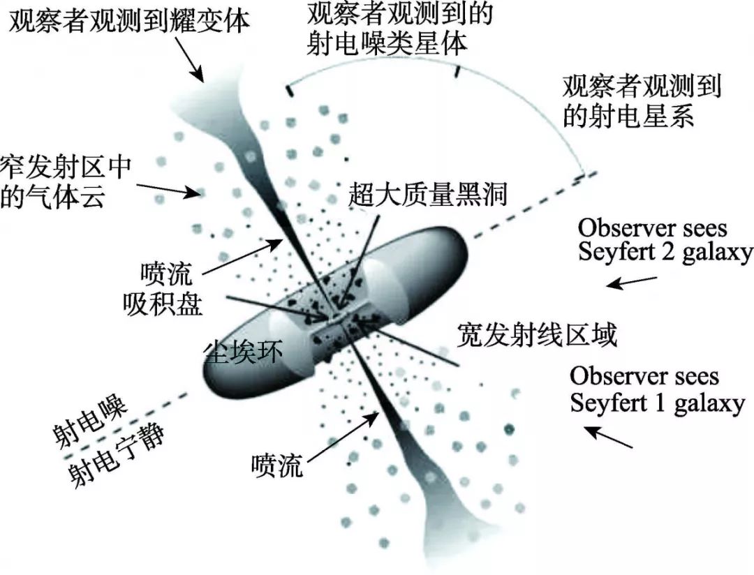 活动星系核(AGN)是一类中央核区具有激烈活动的河外星系,是宇宙中已知的最亮的天体,占河外星系的总数10%不到。一般认为,AGN中心存在一个质量在106~1010太阳质量的超大质量黑洞,通过吸积周围的物质从而释放出大量的能量,总光度可大于1048 ergs s-1,并存在吸积盘和尘埃环等物质成分,部分AGN还会在吸积盘的垂直方向形成准直的相对论性喷流。图3给出了AGN的几何结构示意图。