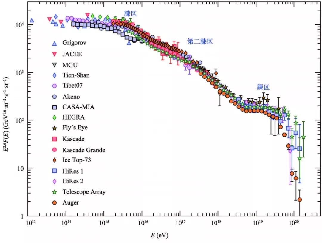 100多年来,利用各种直接和间接探测手段,我们已经获得了从低能109eV到最高可达1020eV的宇宙线。能量大于1013eV宇宙线能谱如图1所示。