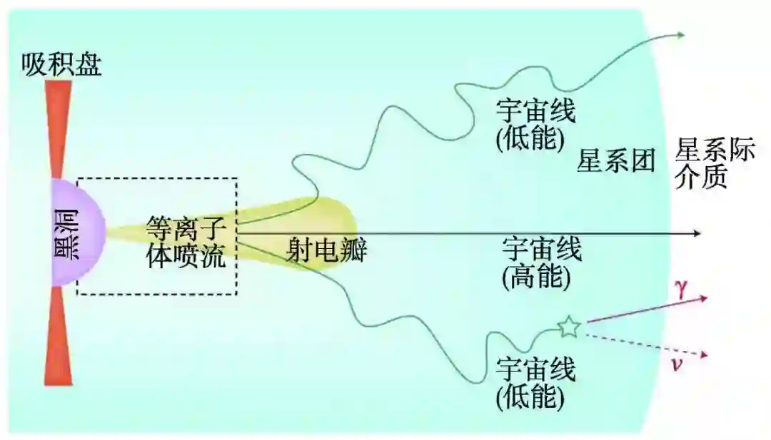 当喷流AGN加速宇宙线粒子到相当高的能量时,极高能宇宙线从喷流中泄漏出来,进入星系团的介质空间。星系团的介质空间可能有较高的磁场和物质密度,当宇宙线的能量较低时,就会在星系团的维力半径内进行扩散运动,与里面的物质发生相互作用,产生中微子和伽马射线,直到耗尽能量也不能逃逸出星系团;当宇宙线的能量达到一定的阈值,宇宙线就会在介质空间里面进行半扩散运动,同样可能与物质碰撞产生中微子和伽马光子,但会逃逸出星系团,进行星系际空间的传播;而最高能量的宇宙线会不受任何作用,直接沿着原来的传播方向逃逸出星系团,进入星系际空间传播。