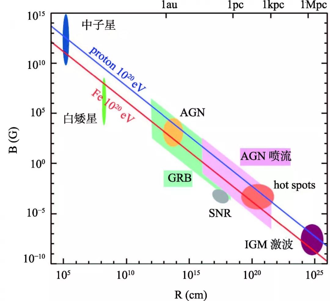 图2 各种可能加速宇宙线的天体在Hillas图的位置。在红线以上的天体可以加速铁核到1020 eV,蓝线以上的天体可以加速质子到1020 eV。可以看到AGN可能具备加速宇宙线粒子到极高能的能力