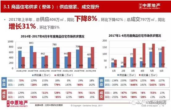 据沈阳中原地产,截至年中,沈阳的房地产去化周期较年初已下降5个月,为17.2个月;上半年总成交面积达797万㎡,同比增长31%。