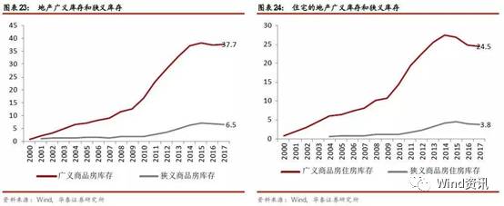 对地产住宅的库存面积的测算:广义库存约24.5亿平米,狭义库存3.8亿平米。