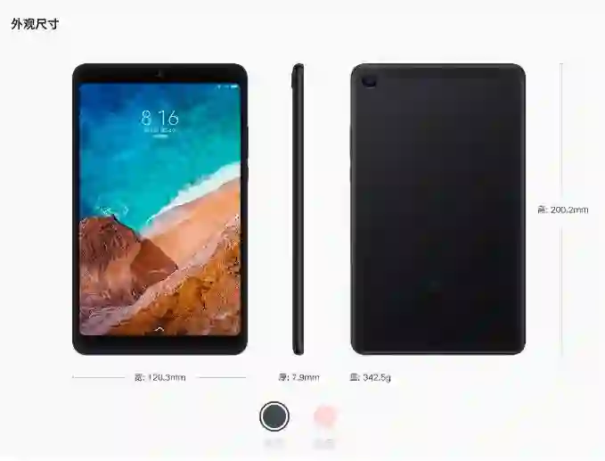 小米平板 4 的宽度为 120.3mm,作为对比,iPad mini 4 的宽度为 134.8mm,这方面,小米更具优势。重量方面,小米平板 4 为 342.5 克,比 iPad mini 4 重大概 40 克。