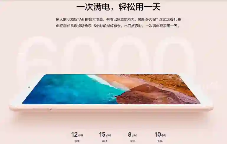 小米平板 4 的电池容量为 6000mAh,和前几代产品差别不大,在这个尺寸的平板电脑上,这样的电池容量是比较常见的。