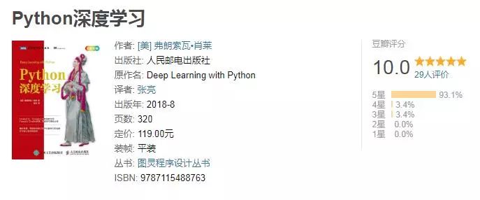 这是一本英文版引进的Python深度学习入门书,英文版书名:Deep Learning with Python,由Keras 之父、Google 人工智能研究员 François Chollet 著作,在豆瓣评分9.4,是亚马逊【语音与音频处理】畅销榜榜首图书。在18年8月份图灵上架了中文版。