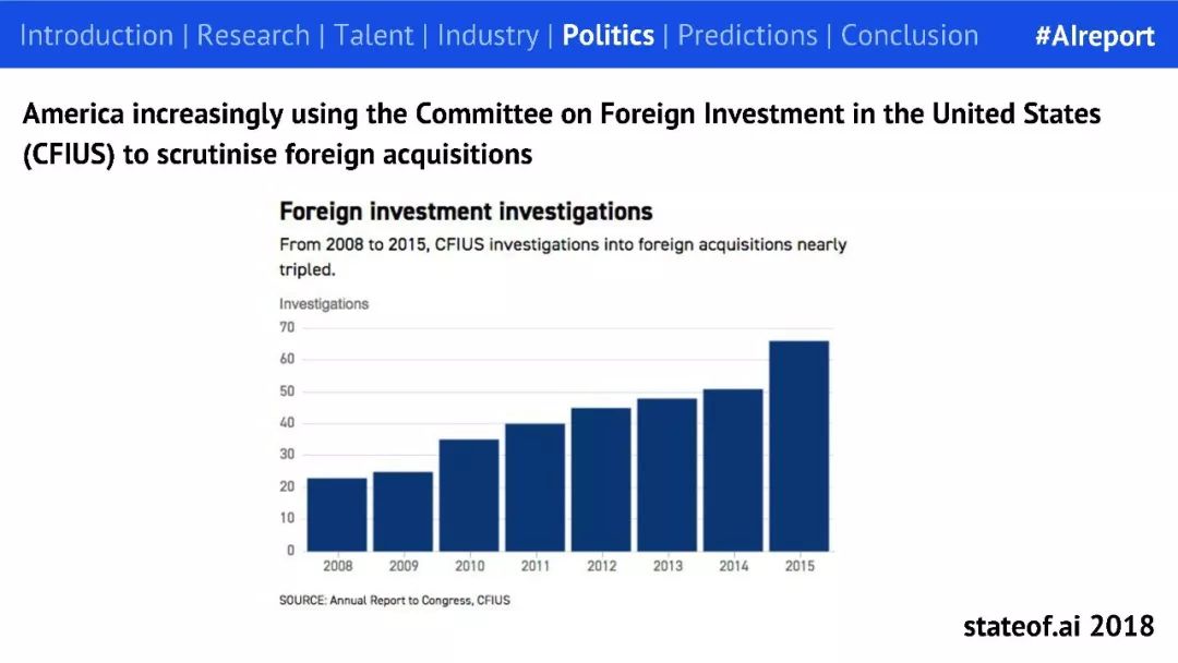 目前,除了在数据获取方面,美国在其他方面均领先于中国。美国也越来越多地通过 CFIUS(美国外国投资委员会)来阻止企业收购美国公司。