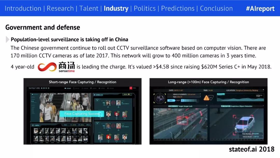 另一个重要行业是政府与国防(Government and defense)。比如中国政府继续推广使用计算机视觉监控软件。2017 年末,中国共有 1.7 亿台闭路监控器。此监控网络将在 3 年内将增长至 4 亿台。成立 4 年的商汤科技遥遥领先,2018 年 5 月获得 C 轮融资后估值超过 了45 亿美元。
