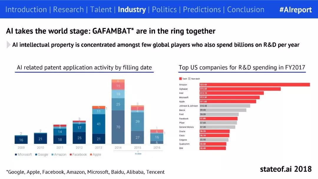 关于 AI 的知识产权,毫无疑问聚集在几大巨头公司:GAFAMBAT(谷歌、苹果、Facebook、亚马逊、微软、百度、阿里巴巴、腾讯),它们每年的研发费用达数十亿美元。