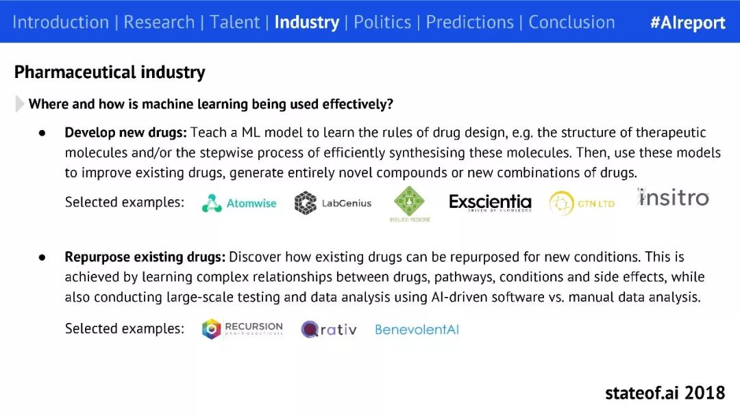 在实际应用行业当中,人工智能发挥了什么作用?相信大家最近都听说了一部爆口碑的电影《我不是药神》。天价药物的存在,寻找仿制进口药,无疑反映了医药行业发展进程慢且药品价格昂贵。