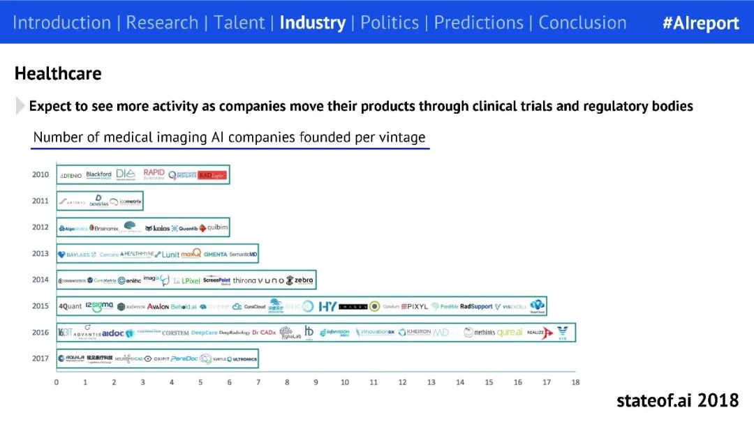 机器学习可以怎么做?报告表示,机器学习可用于开发新药,或者改变现有药物的用途。这里面的公司包括苏格兰初创公司 Exscientia,目前已跟葛兰素史克公司达成合作;用机器学习进行药物研发的公司 insitro 等。在保健行业,机器学习可用于医疗成像、液体活检等。预计相关公司产品通过临床试验和监管检测之后将会采取更多行动。