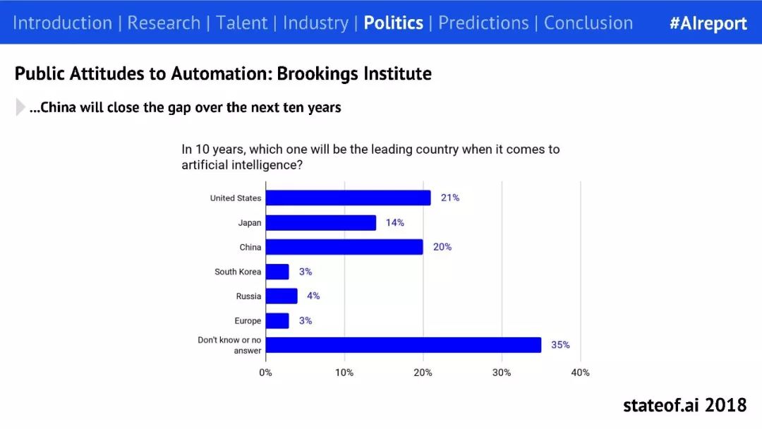 在公众对自动化态度调研这一部分,布鲁克林研究中心的调研结果显示:虽然美国目前仍然是 AI 领头羊,但认为中国在 AI 领域将在十年内赶超美国。