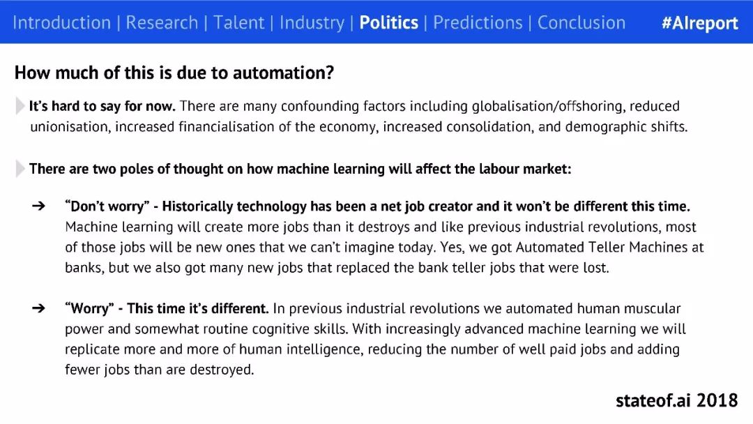 自动化在导致美国劳动力市场现状中起到多大的作用不得而知,关于机器学习对劳动力市场的影响也出现了两极分化的观点: