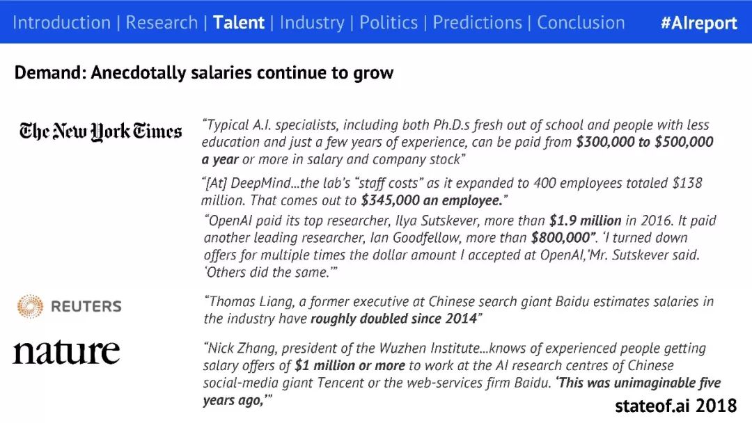目前,全美人工智能岗位空缺 10k,Element AI 预计全球有 22000 名 AI 研究者和工程师拥有博士学位,预计全球有 5000 名高级 AI 研究者。