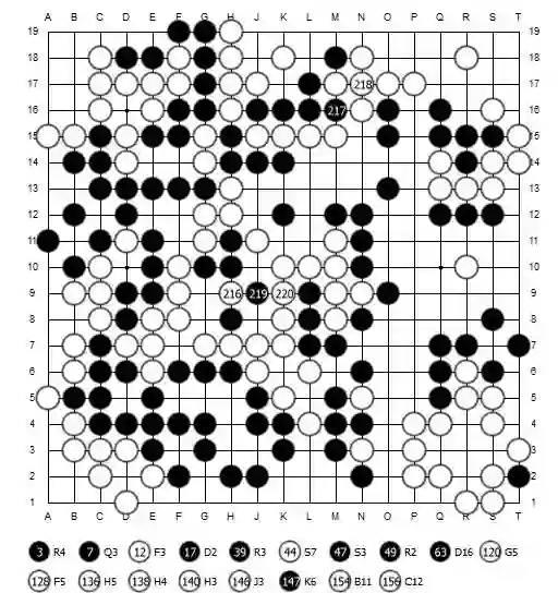 中午 12:30 团体赛开始,猜先后,由周睿羊代表人类棋手一方执黑棋,黄士杰博士代表 AlphaGo 执白。布局阶段波澜不惊,人类方吸取了上午比赛的教训,选择了三三布局而非星位。比赛中,团队五人时常出现分歧,长考频出,耗时较快。行至 42 手棋时,AlphaGo 再次在右上角点三三,这一招目前已成为 AlphaGo 的招牌进攻方式,并已被职业棋手效仿应用。