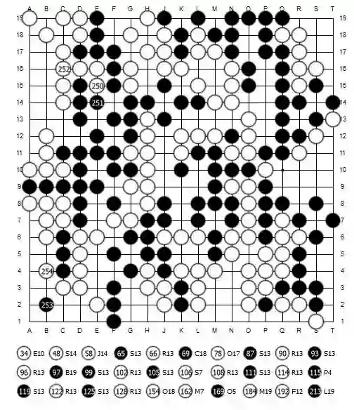 行至 70 手,形势落后的人类团队决定在上边屠杀白棋大龙,但被白棋在 80 手大飞化解。随后两方在右上角展开劫争,双方消耗劫材。到 133 手,黑棋在右上角开劫,侵蚀了右上角白棋的领地。比赛逐渐进入收官阶段。至 186 手,唐韦星上前代替周睿羊接手落子。行至 254 手,在左下角扑得手后,因大势已去,团体五人决定投子认负。