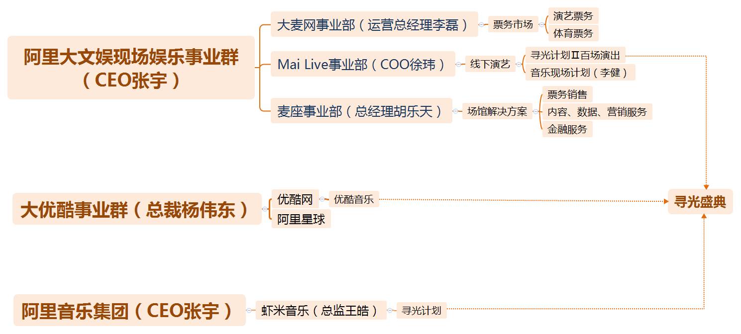 年中,阿里大文娱集团总裁俞永福提出阿里影业要做行业的“基础设施建设”,阿里音乐也在本月提出“音乐基础设施建设”,而本次大麦网升级为“阿里文娱现场娱乐事业群”,用张宇的话说,新成立的事业群就是要“升级基础设施,赋能现场娱乐新生态”。