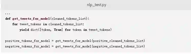添加以下代码,将推文从一个已清理的标记列表转换为以键作为标记、以True作为值的字典。对应的字典被存储在positive_tokens_for_model和negative_tokens_for_model中。