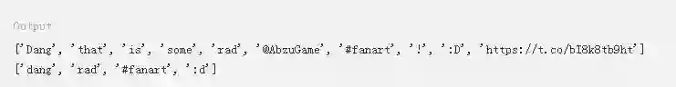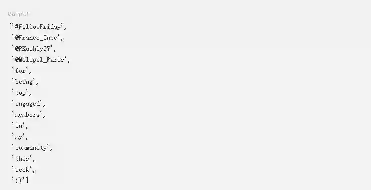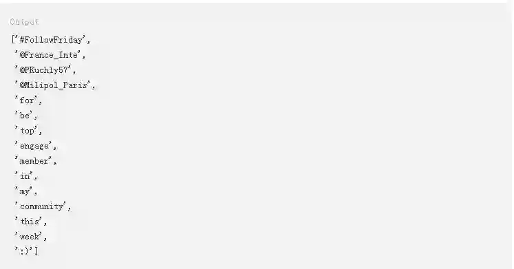 在这里,.tokenized()方法会返回特殊字符,比如@和_。本教程稍后部分将通过正则表达式删除这些字符。