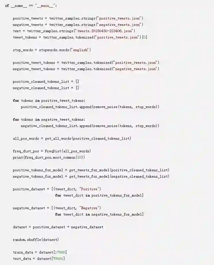 在本教程的后面部分,您将使用负面和正面的推文来对您的模型进行情感分析训练。没有情感的推文将被用来测试您的模型。
