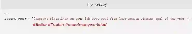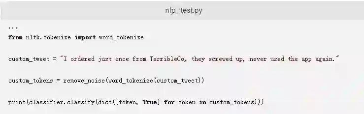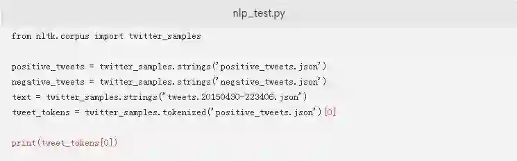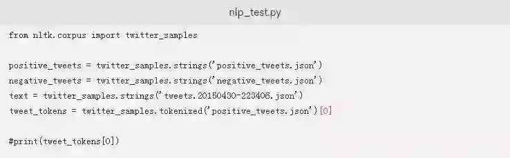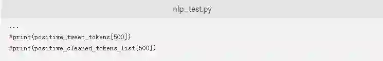 如果您想测试脚本以实际查看.tokenized方法,您只需要将突出显示的内容添加到您的nlp_test.py脚本中。这将标记解析来自positive_tweets.json数据集的一条推文: